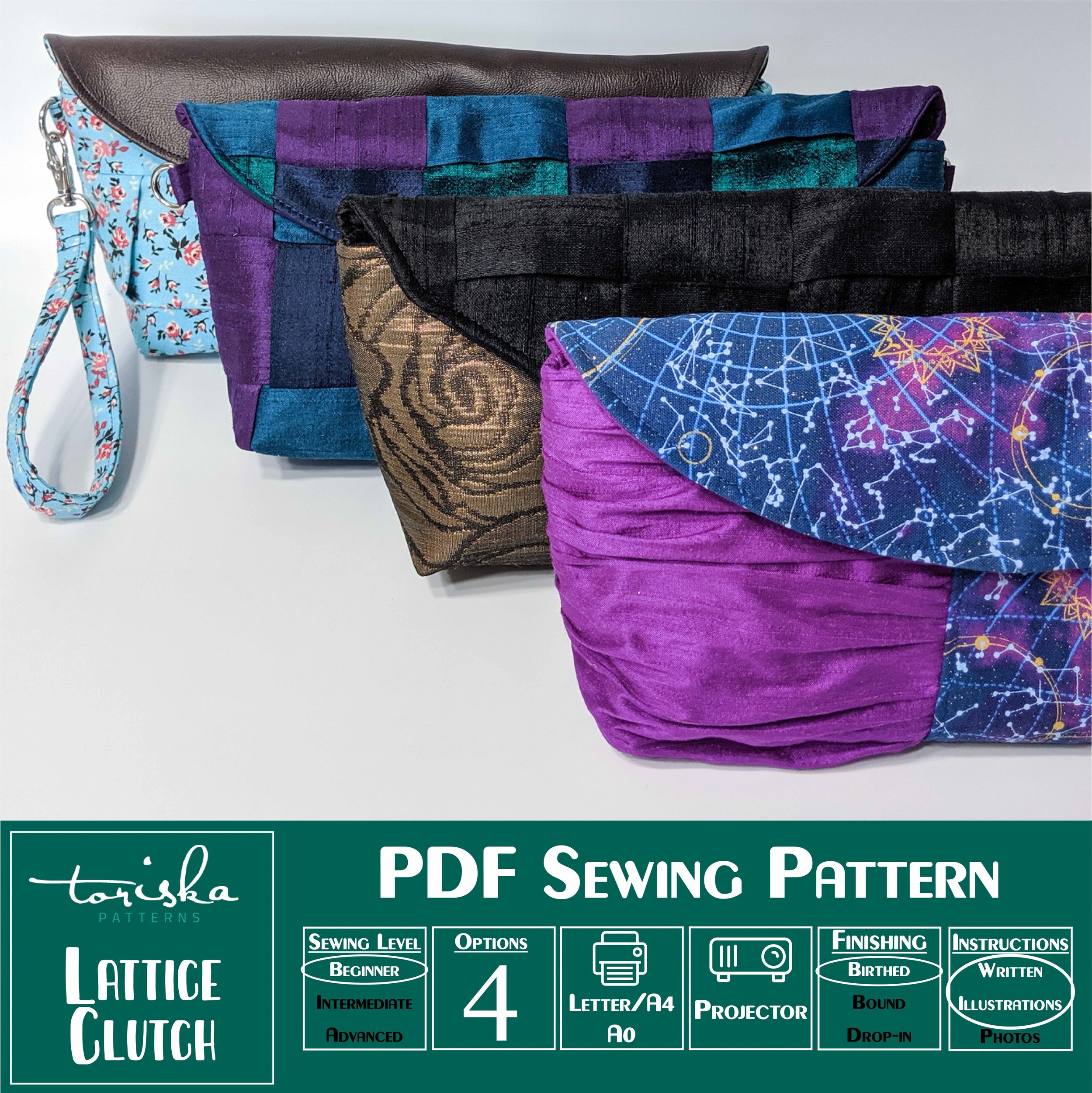 The Lattice Clutch is an easy-to-sew clutch with a lot of style. It is can be made in three versions, the Basic version, the Woven version, or the Gathered version, and there are two flap shapes. Instructions for adding a strap or wristlet and three different pocket options are also included. This is a great basic pattern that can easily be either casual or formal depending on your fabric choice or embellishments. The Lattice Clutch is suitable for beginner bag-makers.
