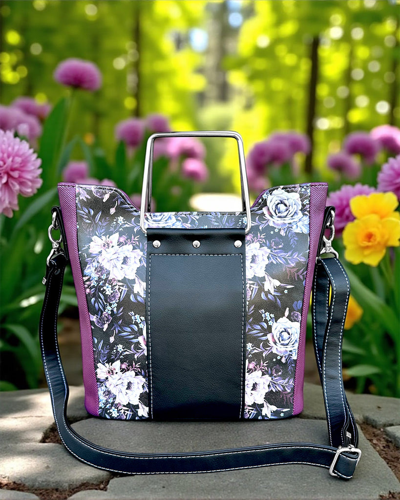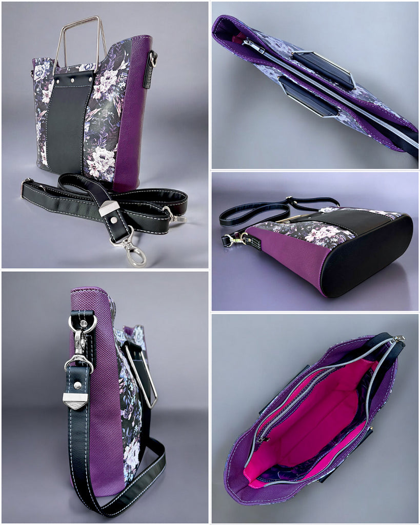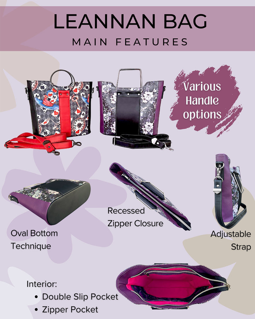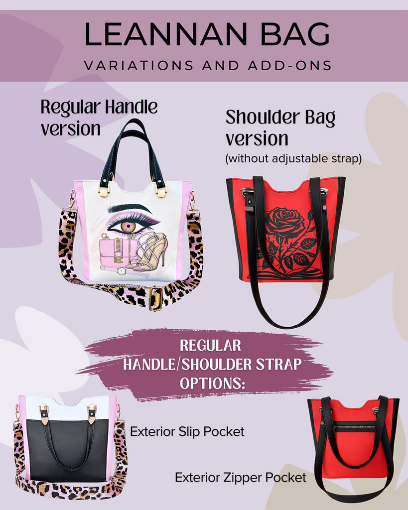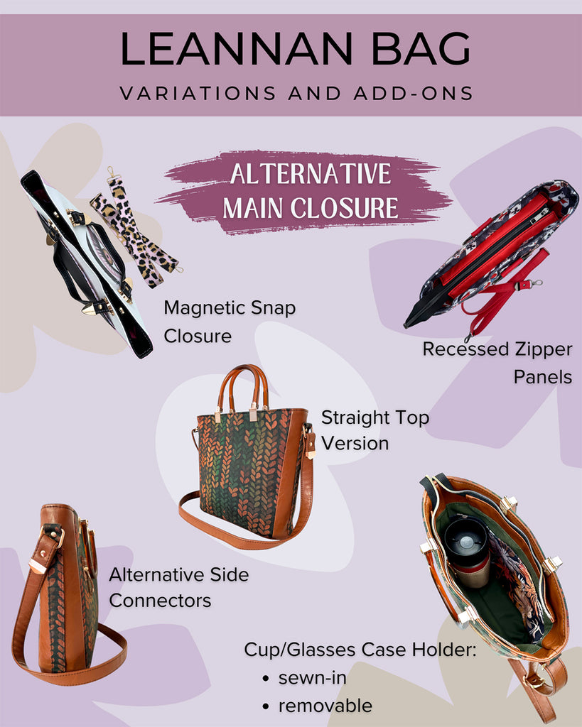 The Leannan bag is a medium size bag with various customization options. The main pattern features a ready-made handle (of various sizes and shapes) with an adjustable strap and a recessed zipper closure. The pattern also has an ADD-ONs section to customize various aspects of your bag, giving you many different looks and features. Different handles/shoulder straps with exterior pocket options, alternative side connectors, different main closure options as well as a cup/glasses case holder.