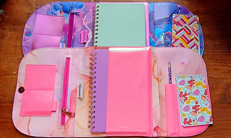 Finished organizer size: 9 1/2 x 7" (24 x 18 cm) – fits A5 size notebook or book