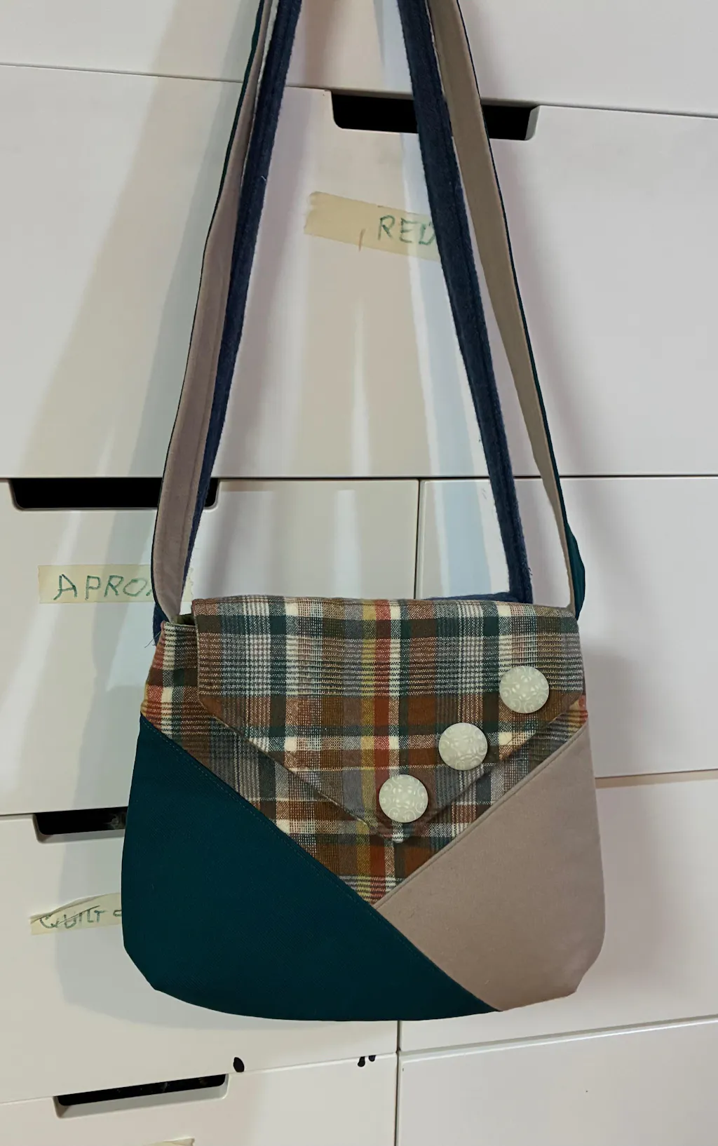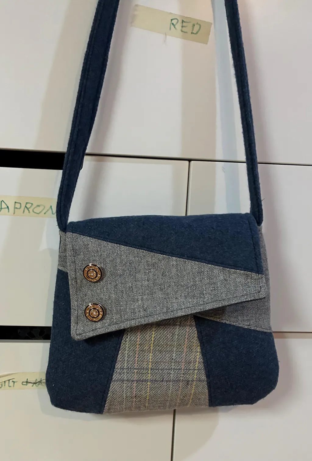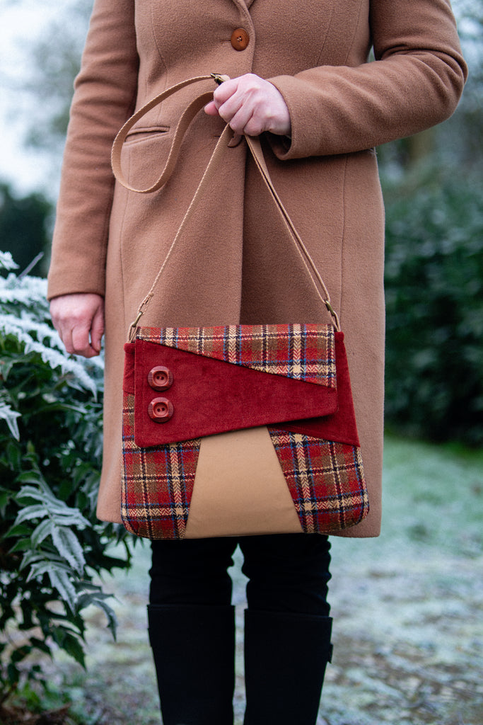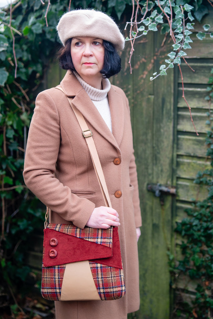 A stylishly simple retro cross-body bag with clean lines and asymmetrical details. The Covehithe Messenger Bag is made with a multi-pieced front and a plain back, making it ideal for using some smaller pieces of contrasting fabric. The style also features a two-part asymmetric flap and has templates and instructions for both zippered and patch interior pockets. The strap can be made from self-fabric or from webbing (adjustable). The style is named after a village on the Suffolk coast.