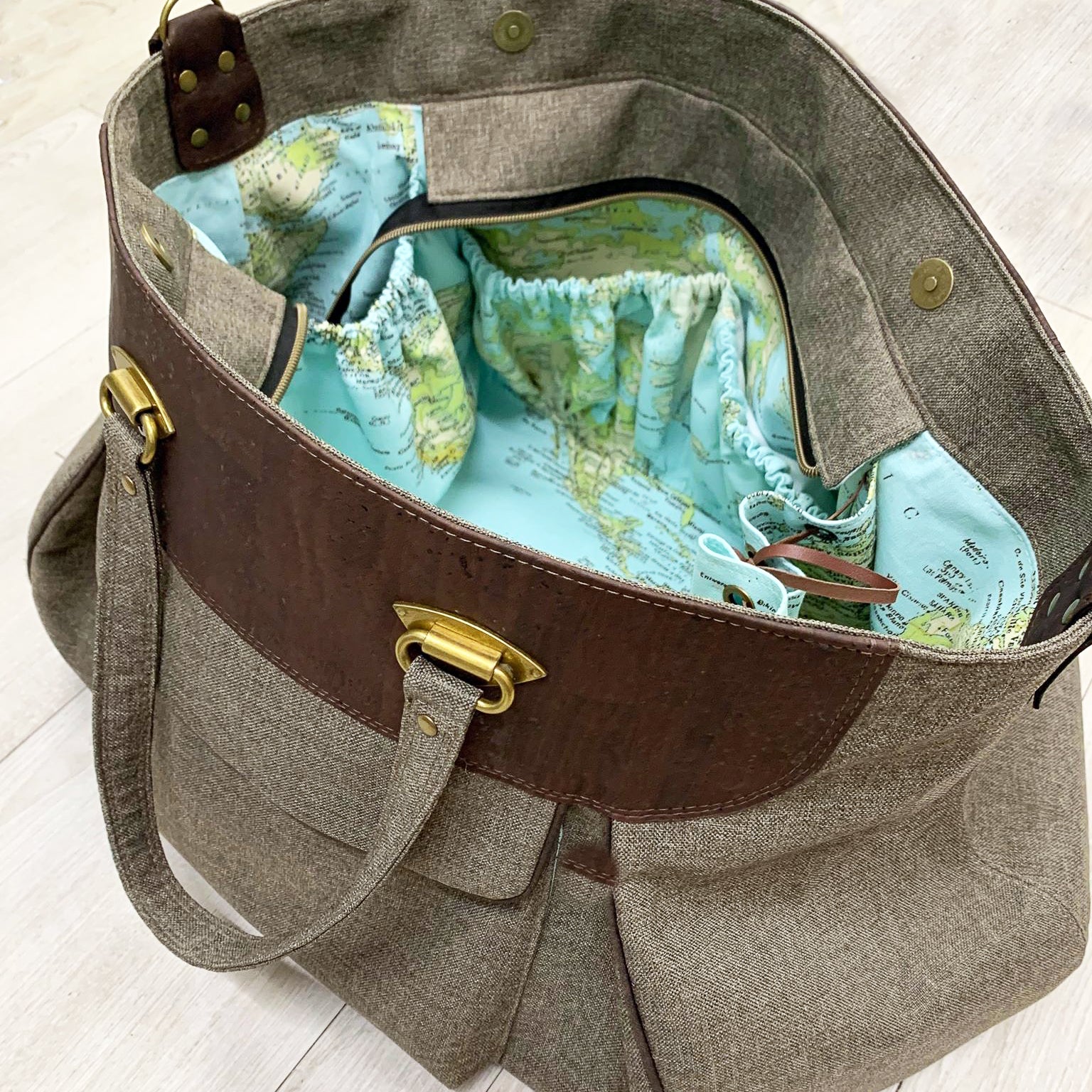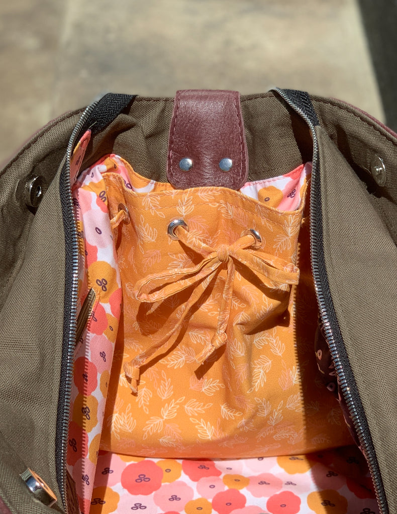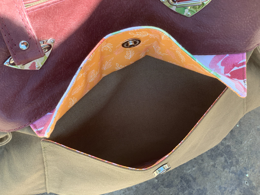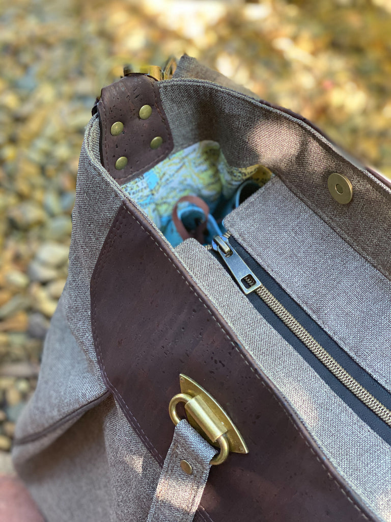 In this pattern you will learn how to install a variety of hardware, attach accent pieces, install zippers, create pleats, and beautifully finished exterior and interior pockets. The Goldfinch Weekender is an intermediate pattern with a high-end finish.