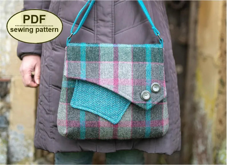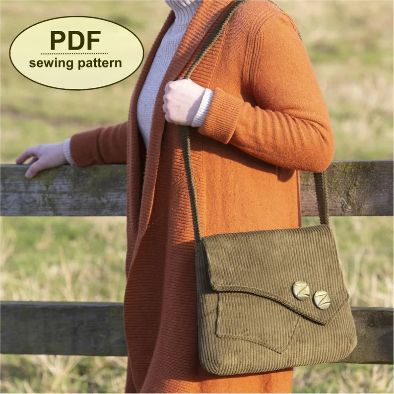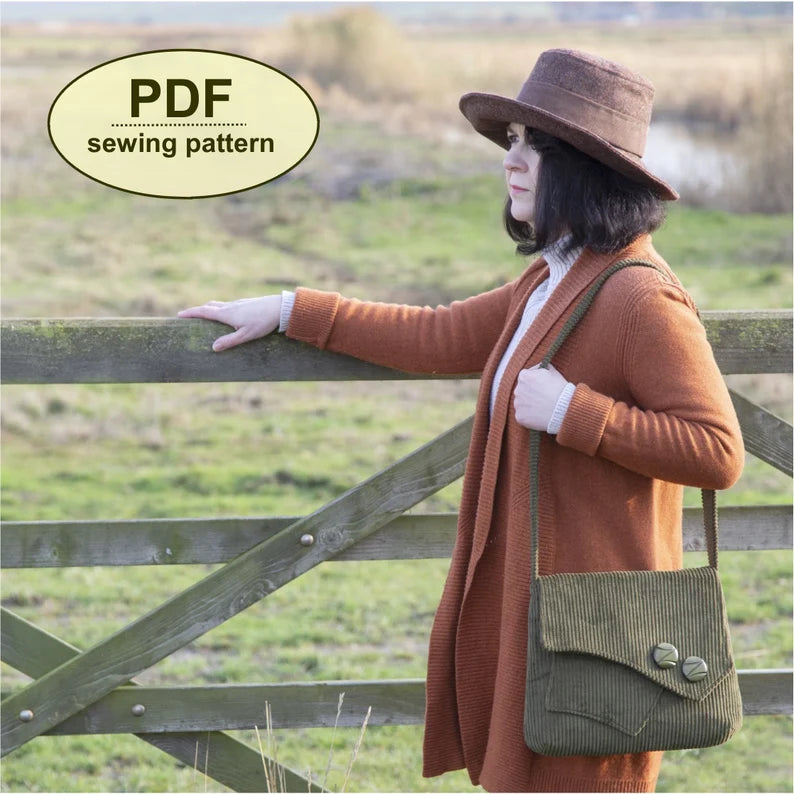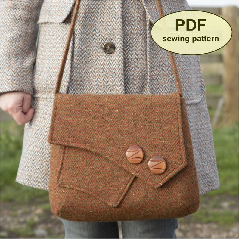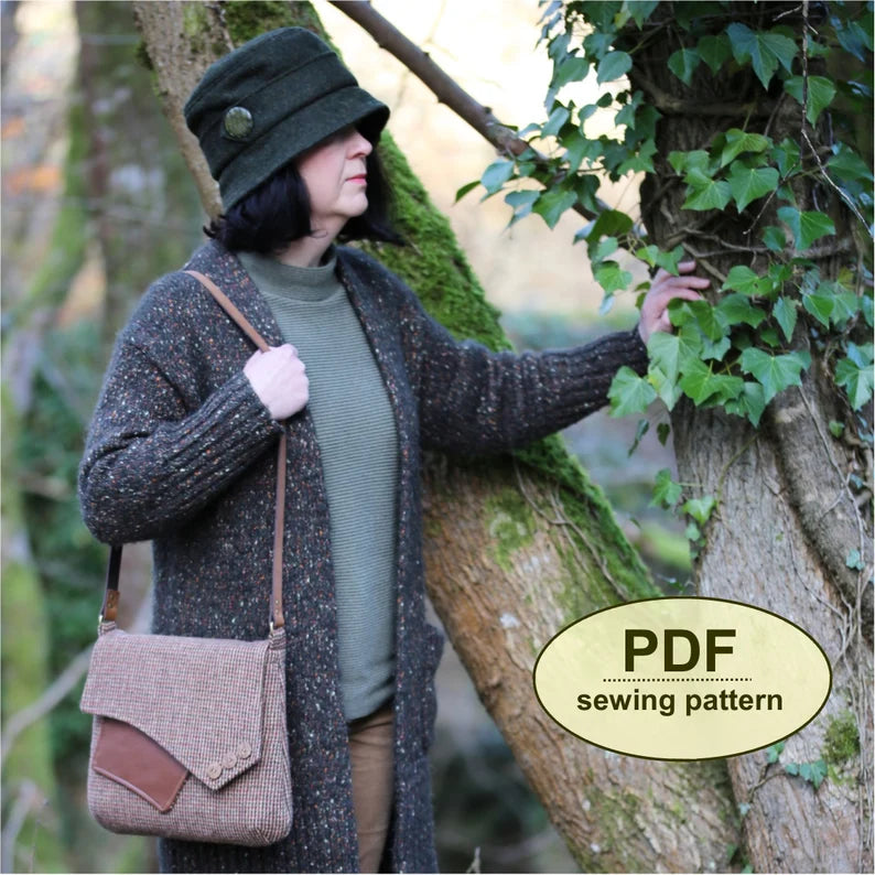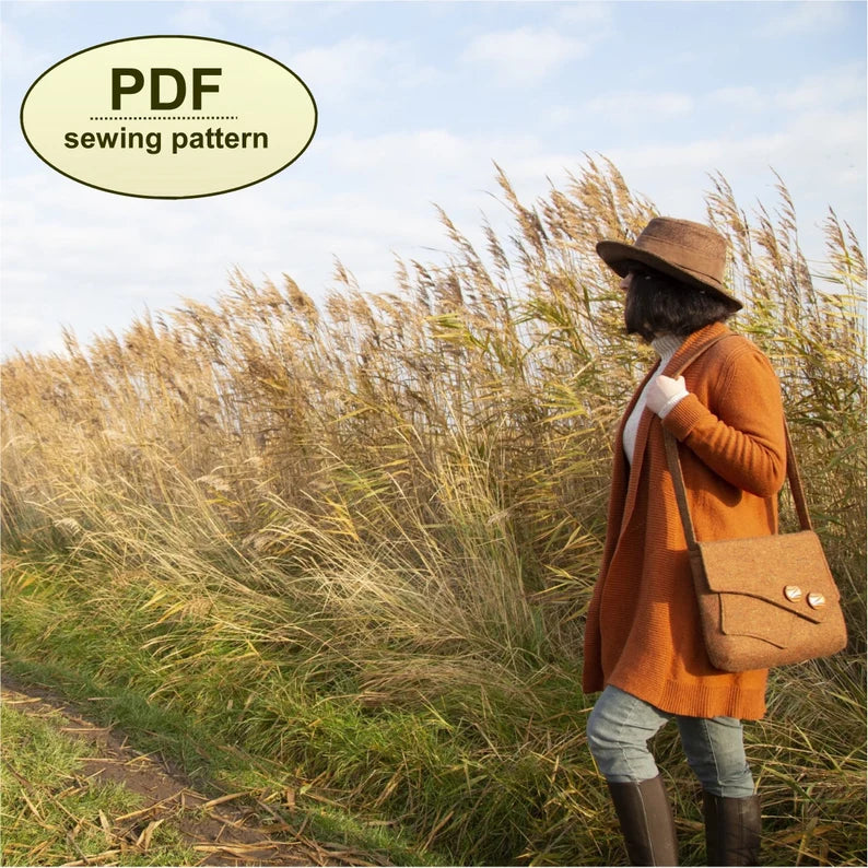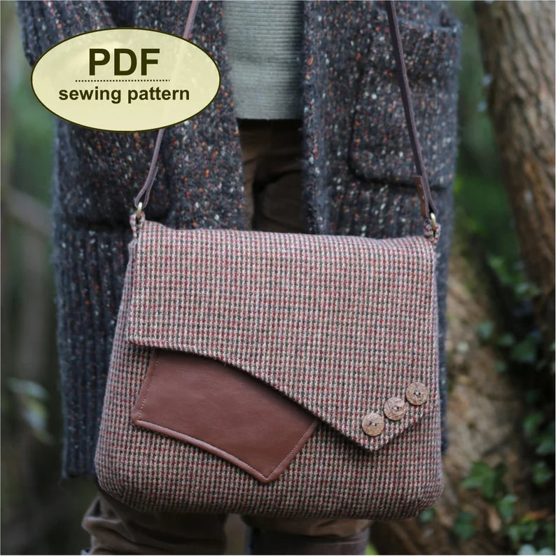 This is a PDF sewing pattern for The Gunton Messenger Bag. The simplicity of this elegant but practical style is evocative of the 1940s era, with its unusual asymmetrical front pocket, flap and button placement.