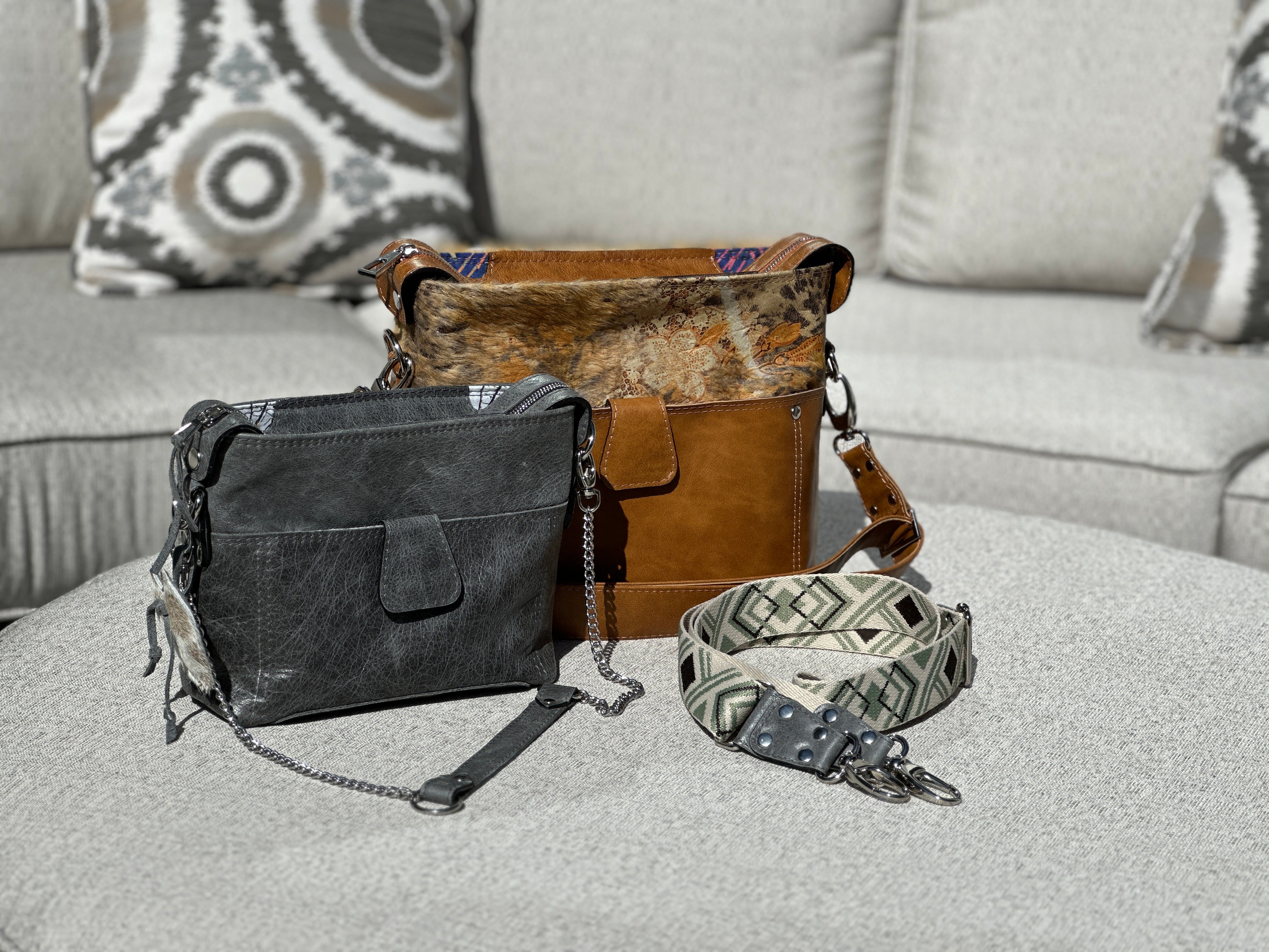 A fashionable sized handbag with plenty of room for all the necessities. Included is an interior zipper pocket with two unique zipper overlays to chose from, a slip pocket as well as interior credit card slots. The unique top zipper keeps everything secure inside. Two outer slip pockets perfectly sized to hold your phone or any other items that you like to keep handy.