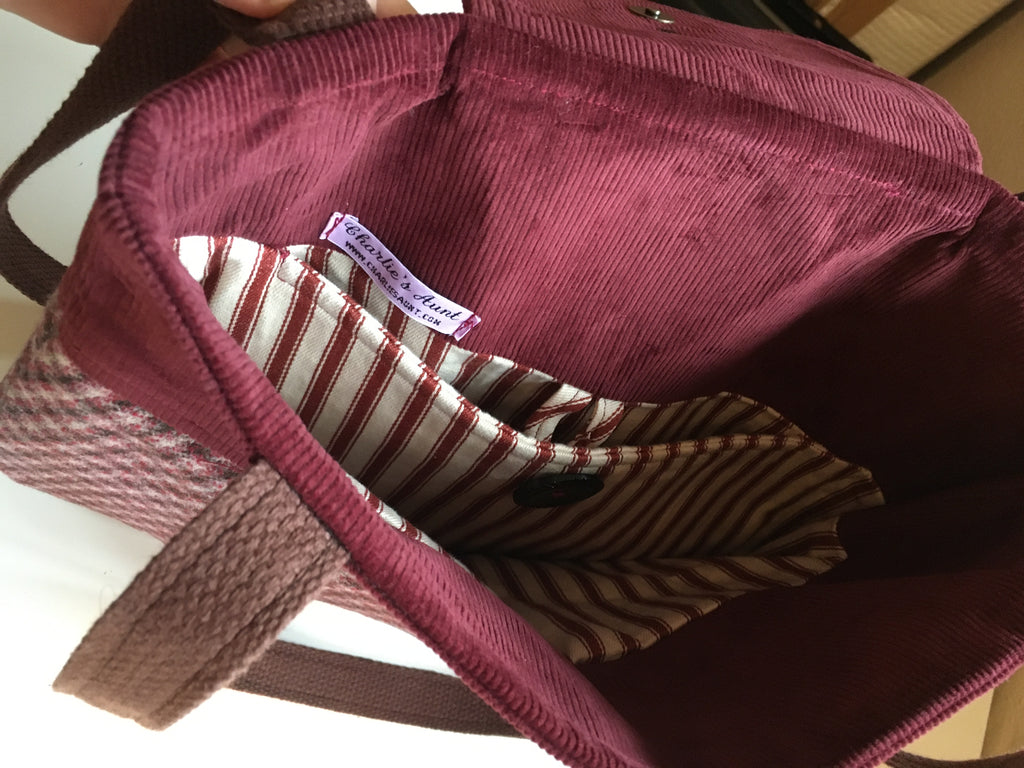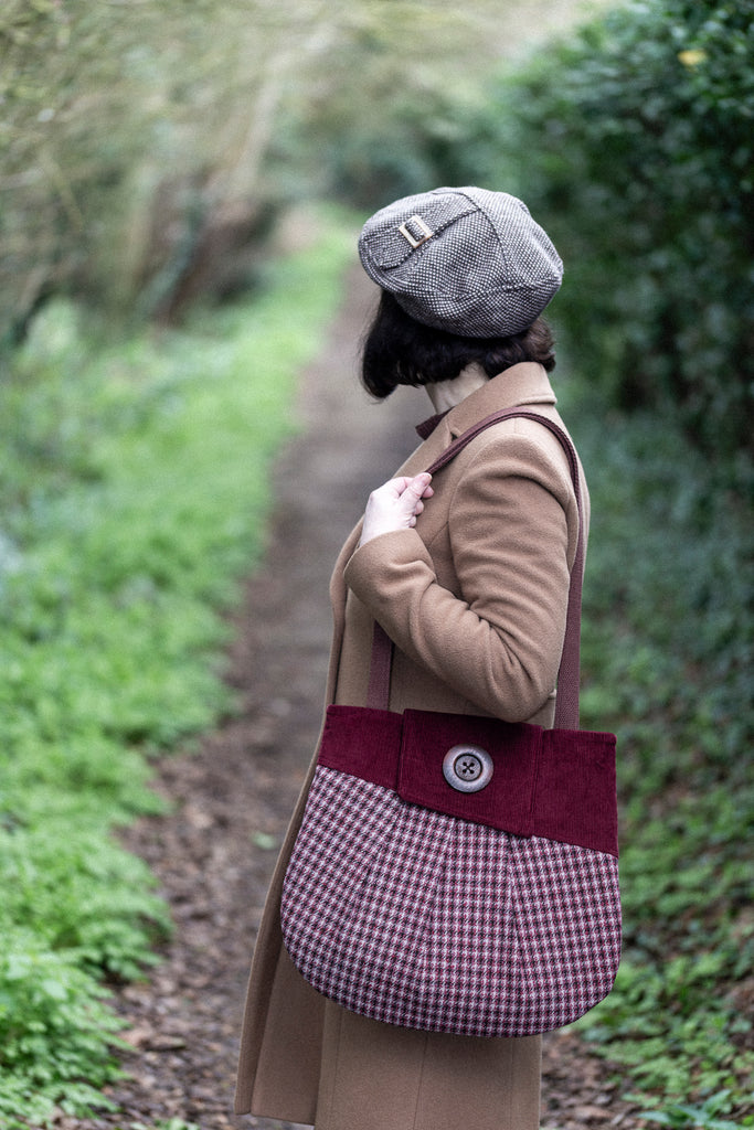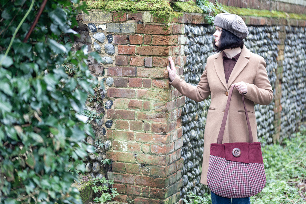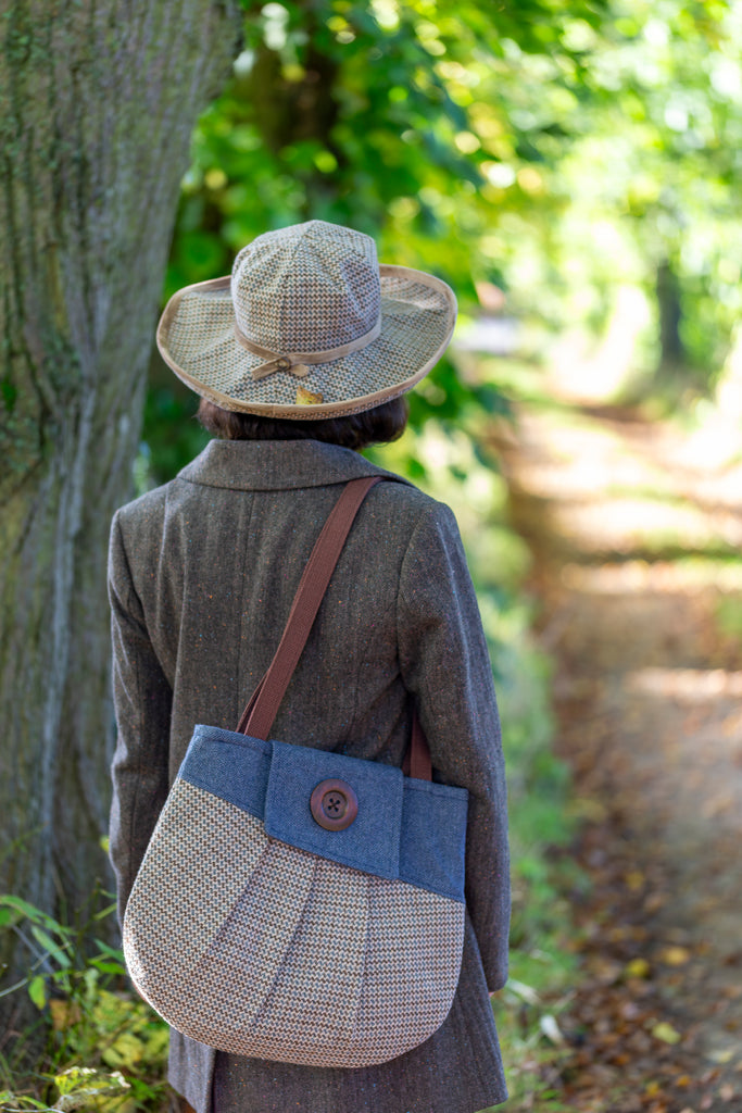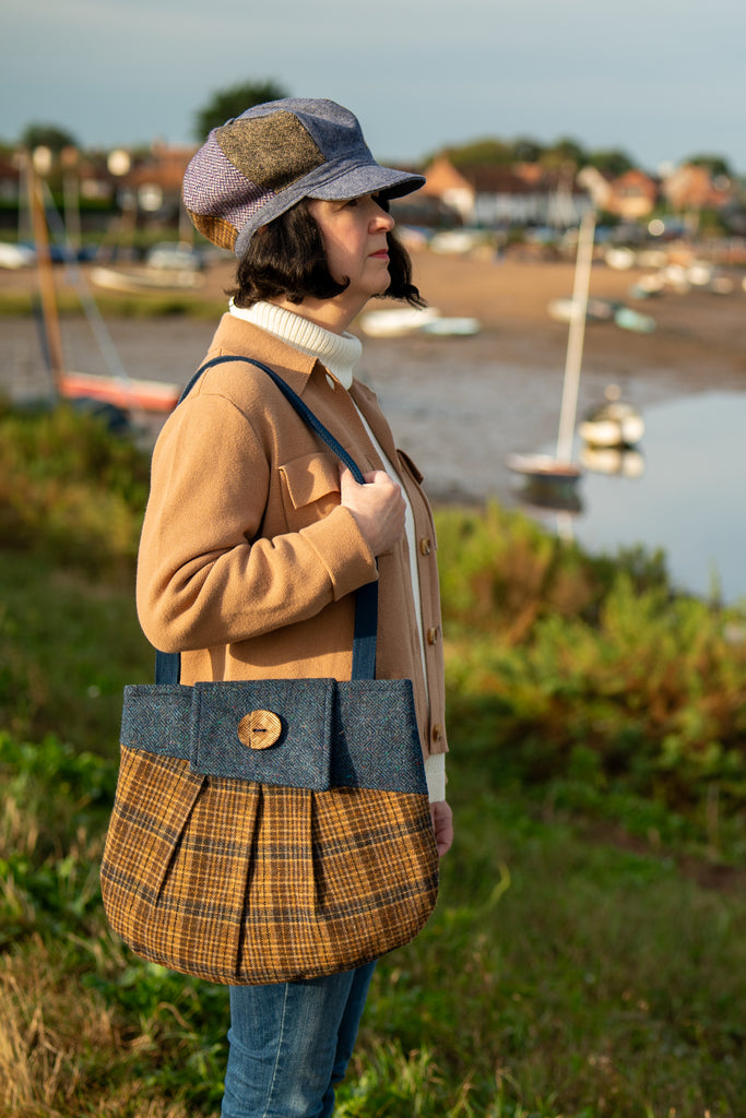 This is a PDF sewing pattern for the Westleton Tote Bag, a classy, large tote bag with a touch of retro, featuring front and back pleats, asymmetric facings and flap, in true Charlie’s Aunt style. Westleton also has an interior pocket than can either be set into the facing seam, or made as a patch pocket. The bag can be made with fleece added to the lining to give extra body.
