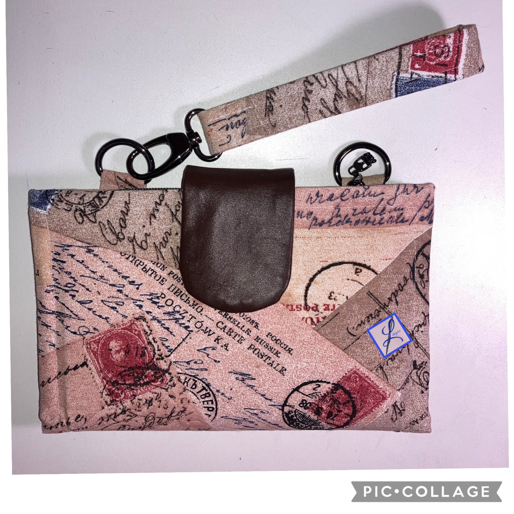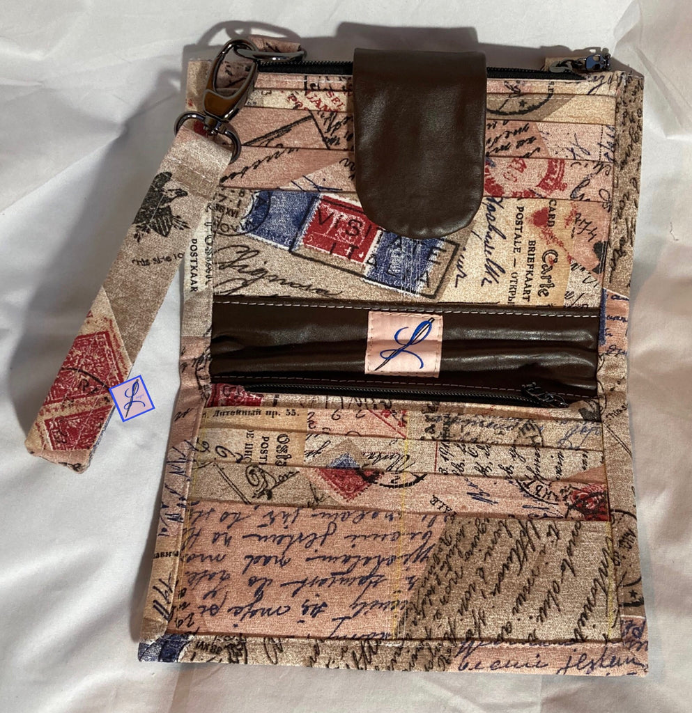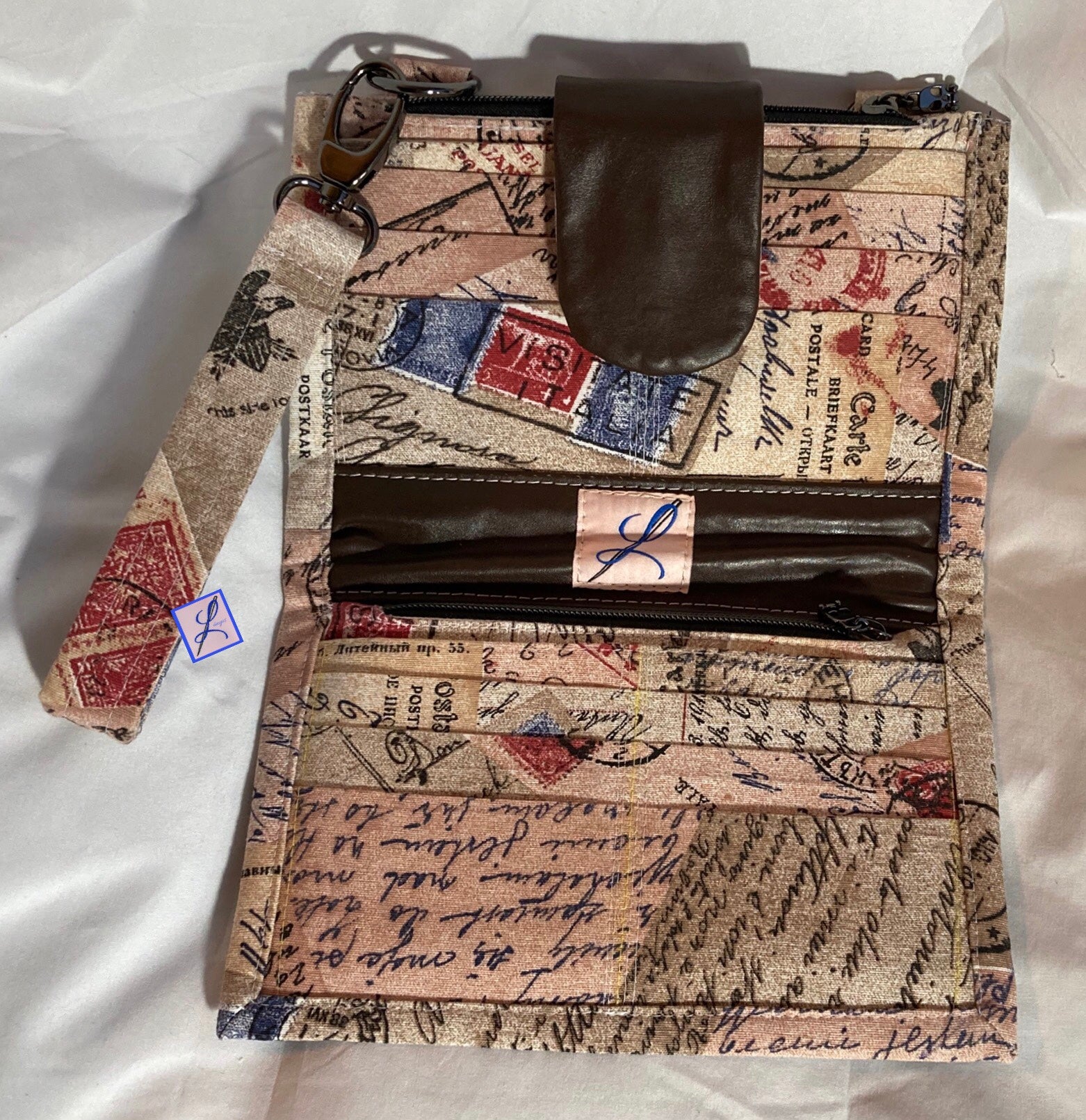 A PDF SEWING PATTERN for the Willow © Wallet/Cell Phone Case, a fully lined wallet 8 1/2″ wide x 5″ tall x 1″ deep when closed (22 cm wide x 13 cm tall x 2.5 cm deep) with two zipper pouches, two card slot pockets that hold 16 cards total, and four slip pockets, each large enough to hold a cell phone! You can sew it up with a wrist strap and an adjustable crossbody strap! NOTE: My cell phone, without the case, was 7" x 3 1/2" x 1/2" thick, and it fit into any of the four slip pockets.