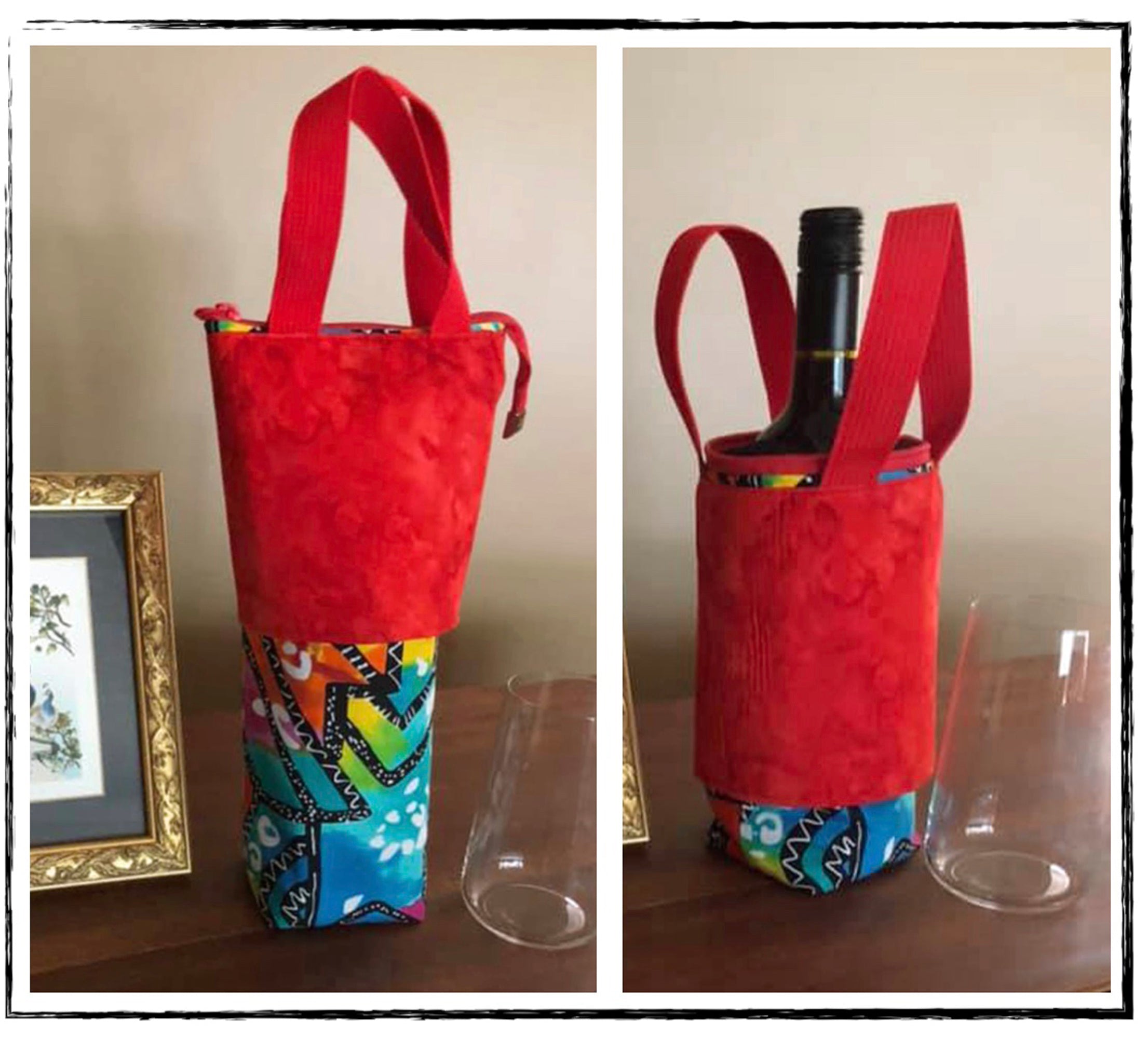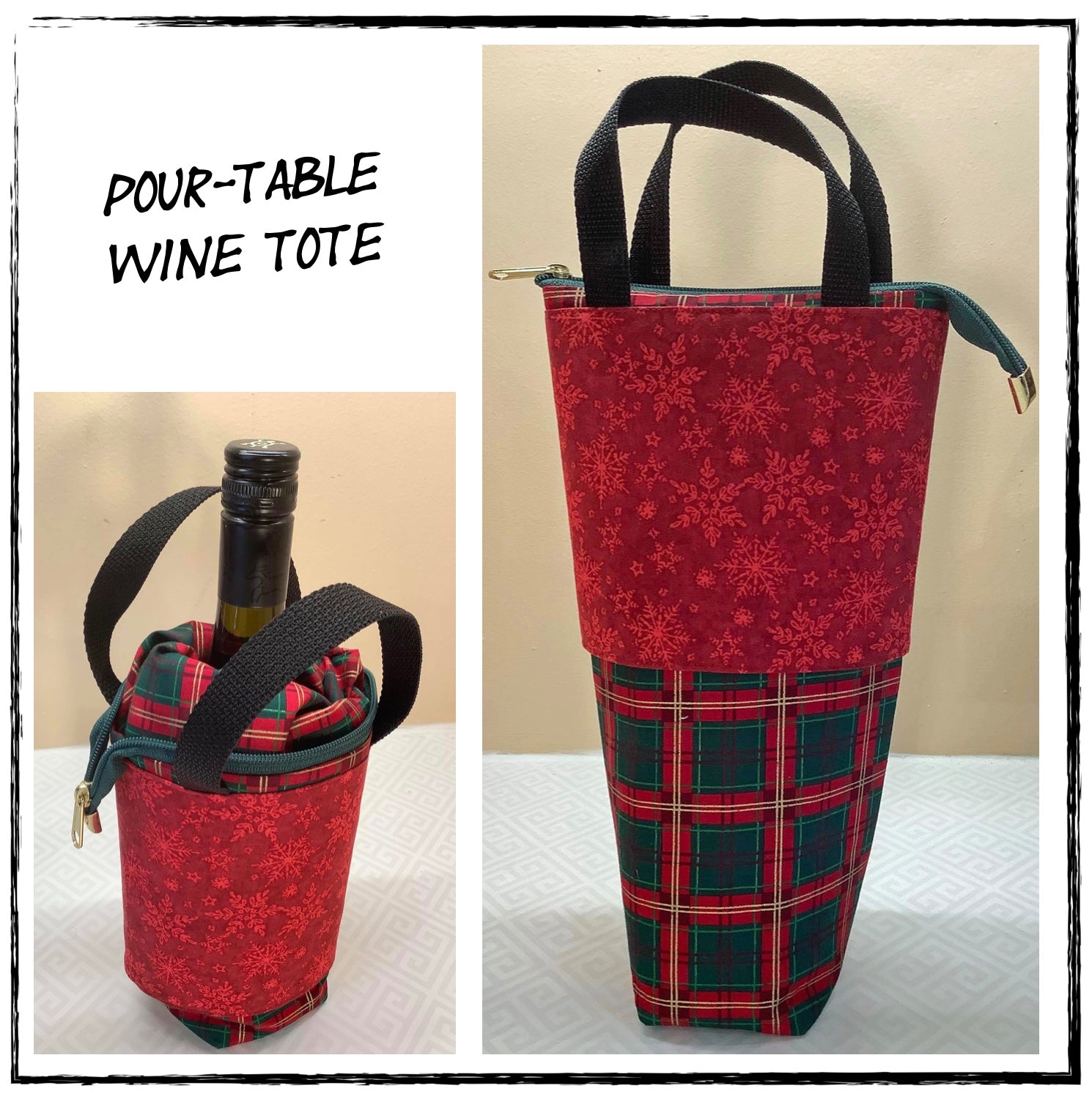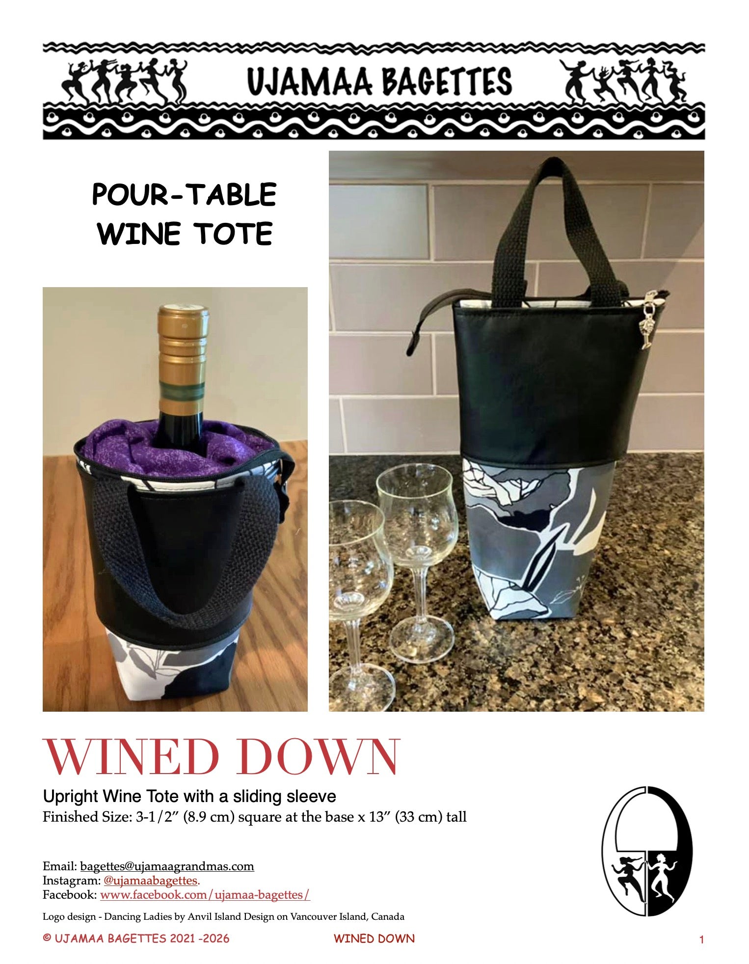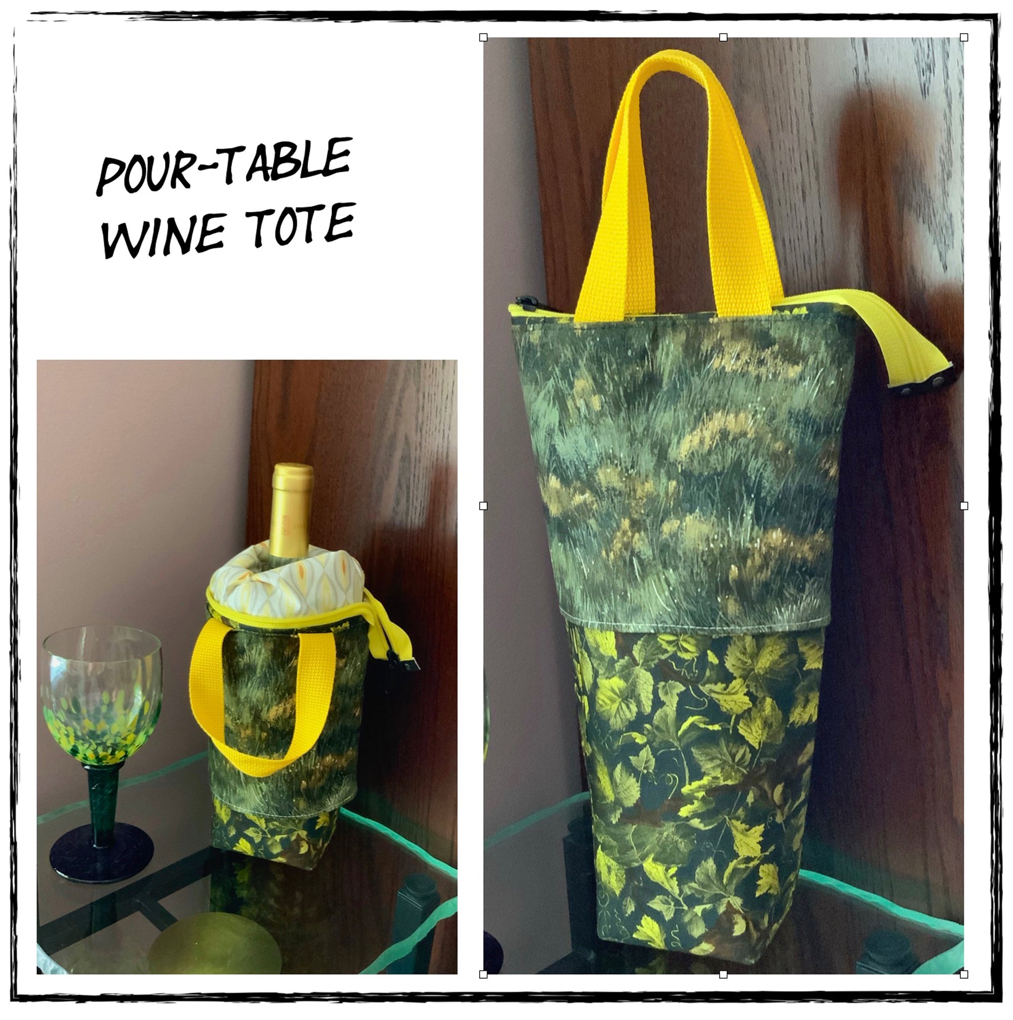 WINED DOWN is an upright wine tote with a secret; the top cuff slides down for pouring. For a chilled wine, there is the added advantage of a bit of insulation to help keep the chill. You can bring along a hostess/host gift in a fancy paper bag but why would you when this pour-table wine tote is so easy to make and so classy too?
